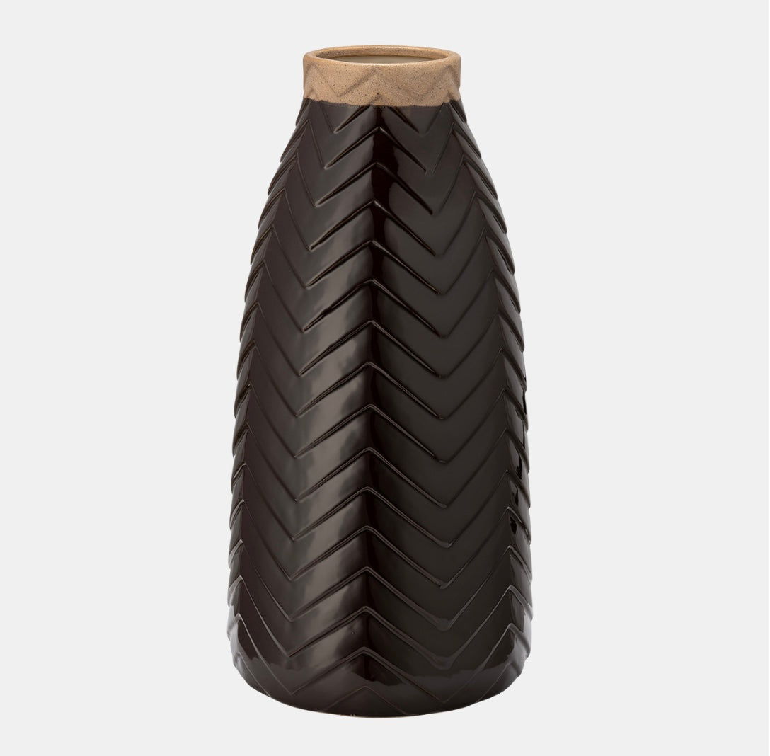 Dark, rich colors and simple designs make for a beautiful, trendy look within any home or office space. Add this ceramic vase to your coffee table, mantle, bookshelf or countertop for a classic, stylish decorative accent. The vase comes in a deep java brown with a lighter brown shade around the opening in a creative chevron line design for an easy to blend in style upgrade. Add brightly colored contrasting colors for an even more standout look!