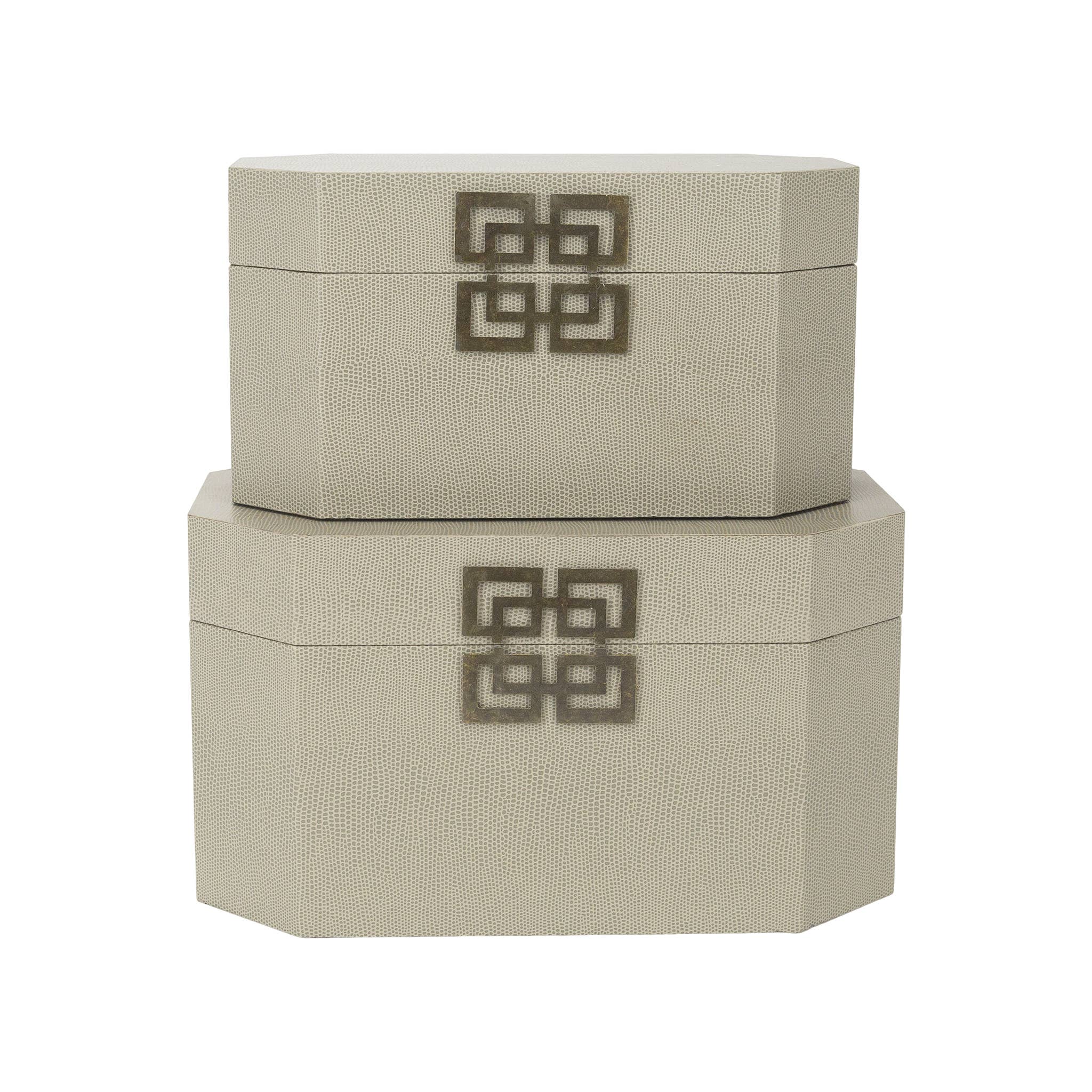 Who said storage could not be stylish? No need to hide these in your closet! They can be used as decorative accents in any room while still providing function of storage. The lids close by a gorgeous geometric brass color medallion